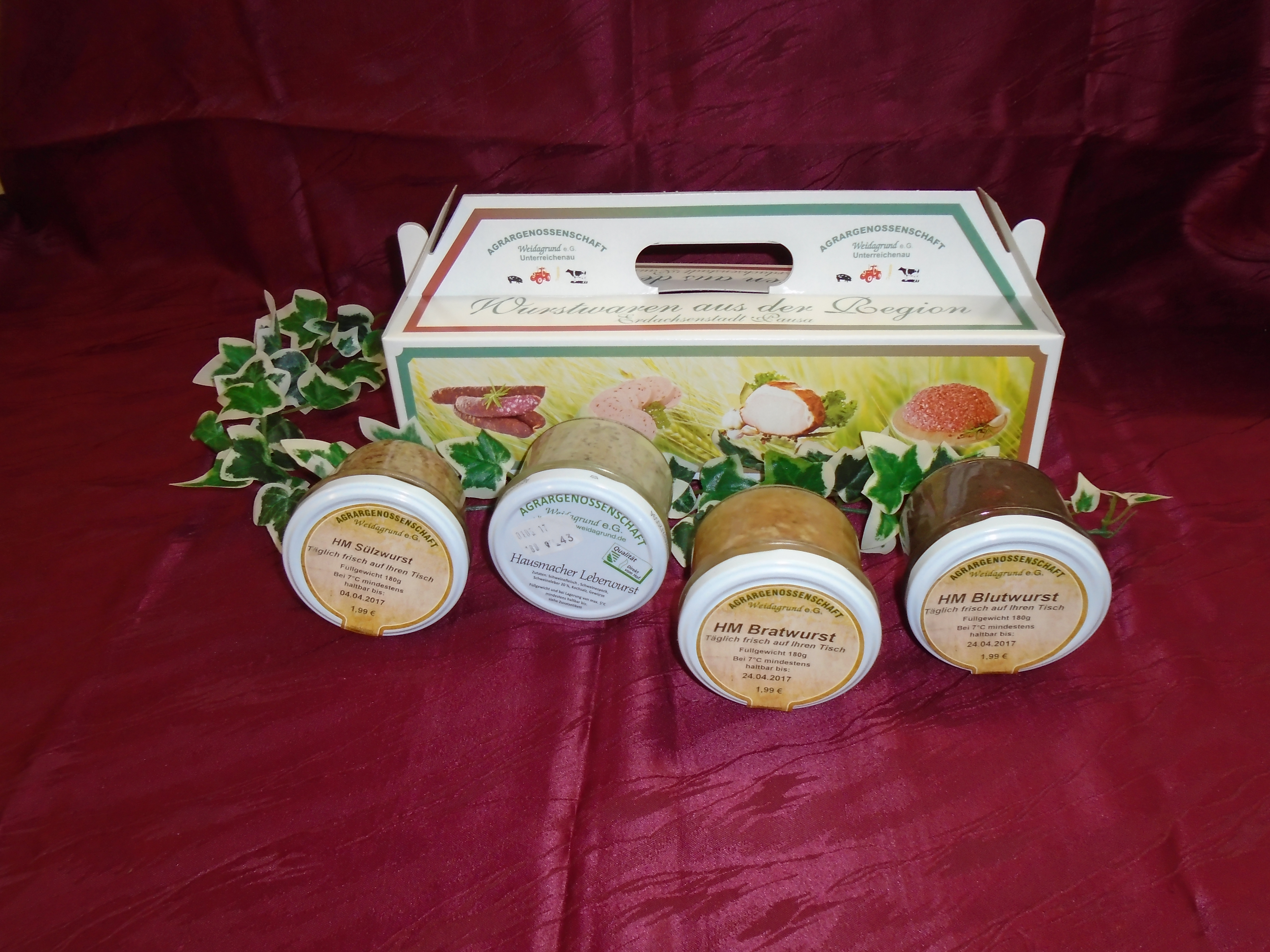 Sie können aus unserem Wurstsortiment 4 Gläser auswählen.